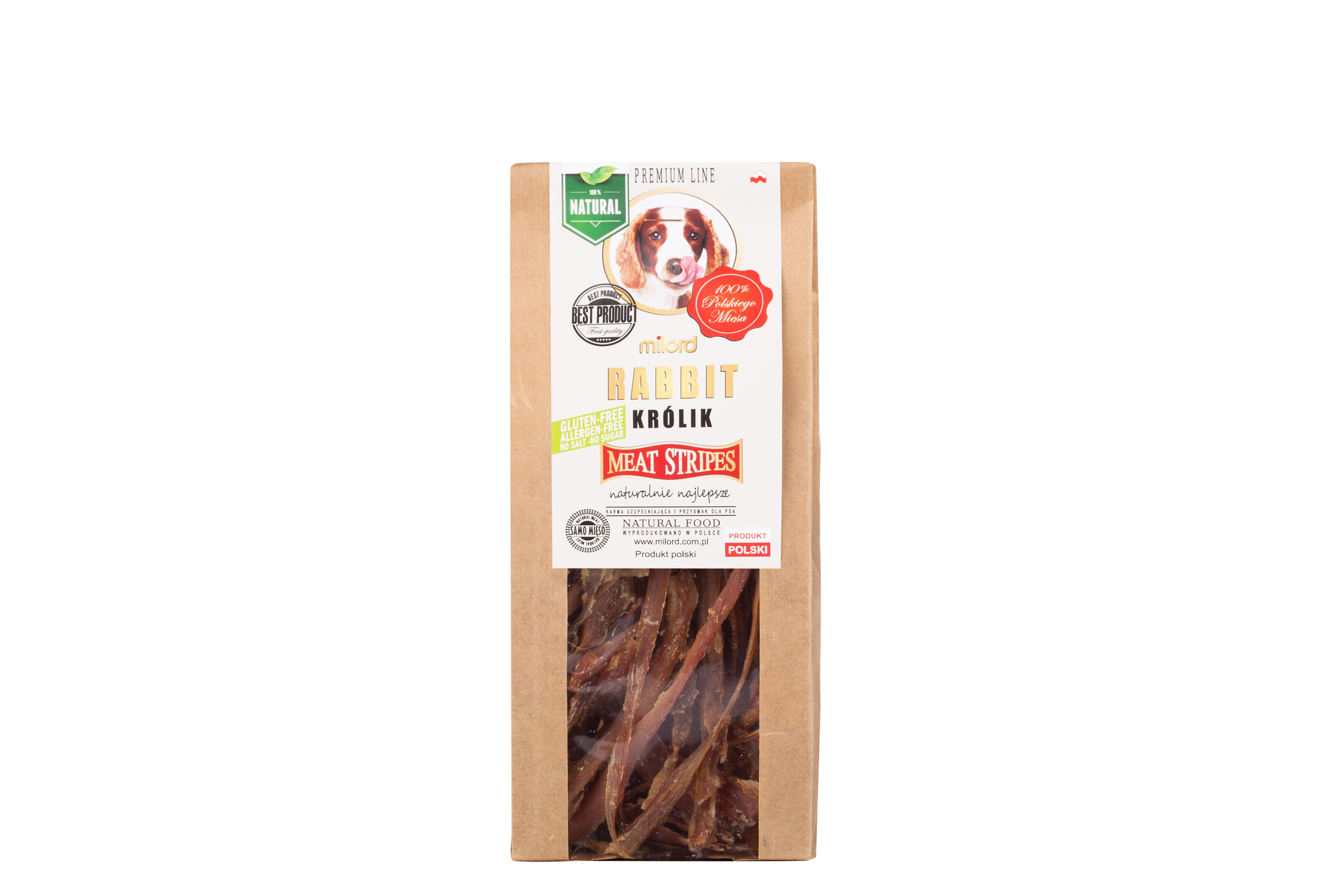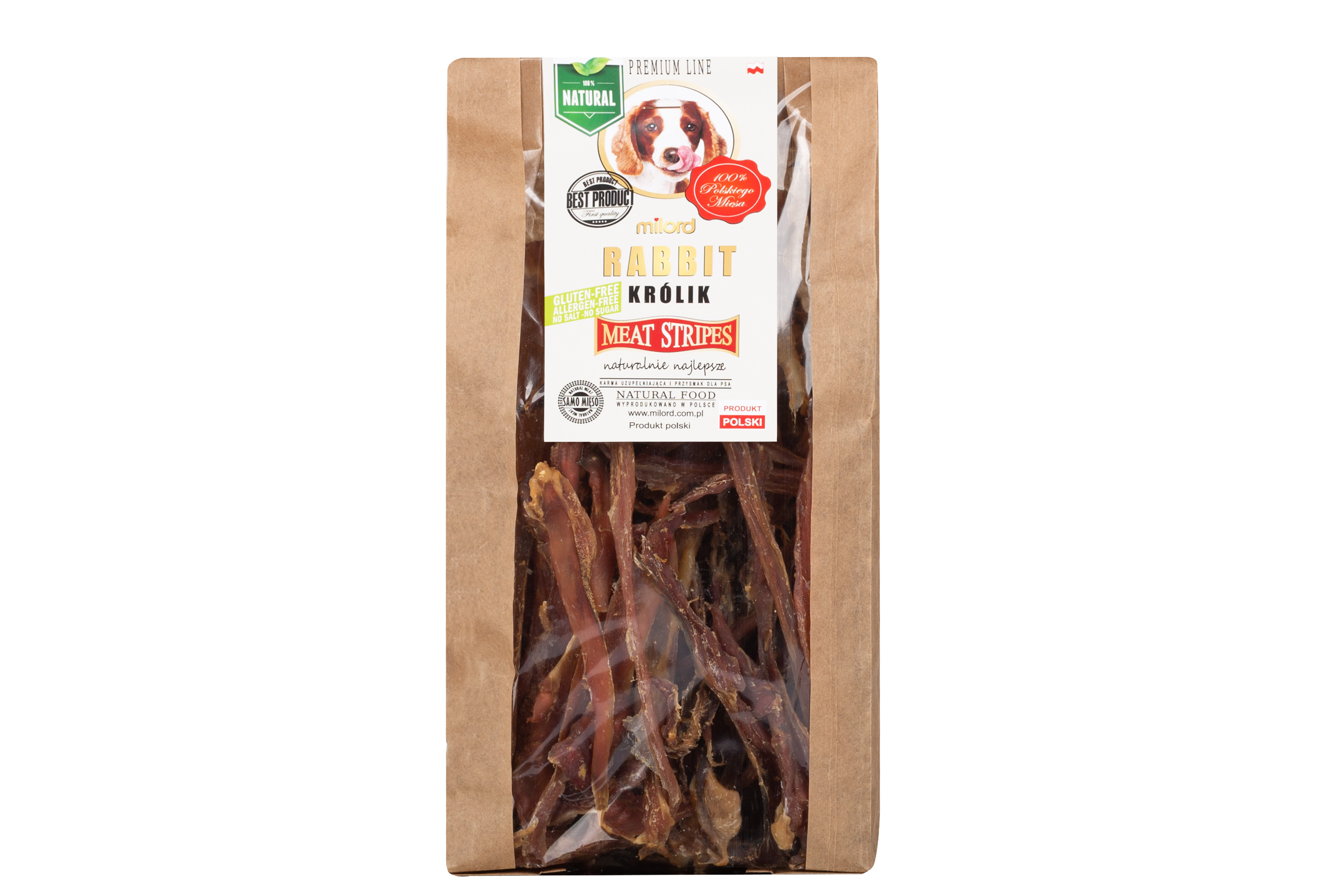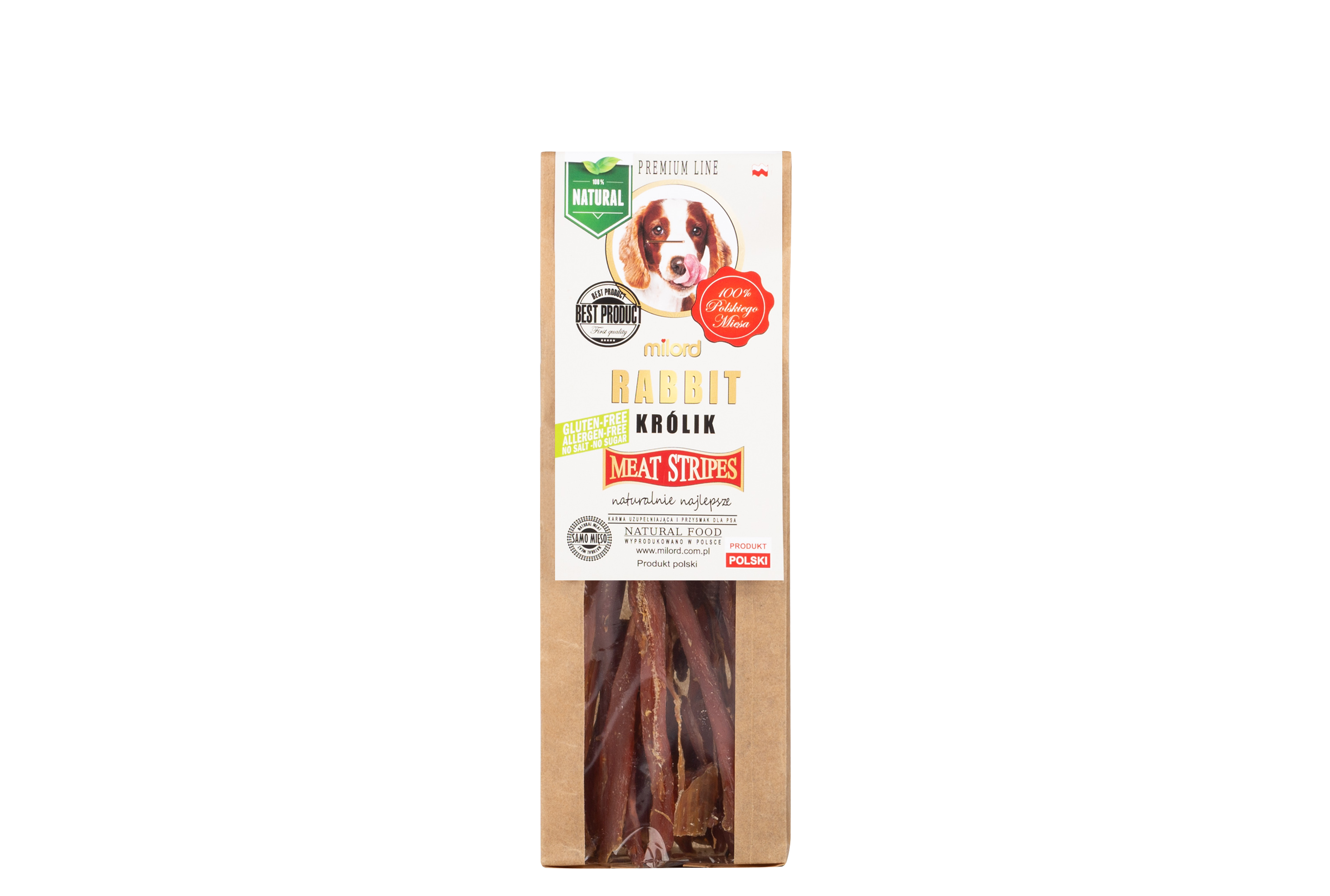 Szukasz delikatnej i zdrowej nagrody dla swojego pupila? Królik w paskach Milord to naturalny, hipoalergiczny przysmak dla psów wszystkich ras i w każdym wieku. Powstaje w 100% z mięsa mięśniowego królika – bez konserwantów, zbóż i sztucznych dodatków. Suszony ciepłym powietrzem, zachowuje wartości odżywcze i naturalny smak. Produkowane w Polsce pod nadzorem inspekcji weterynaryjnej - MILORD WNI 24168303.