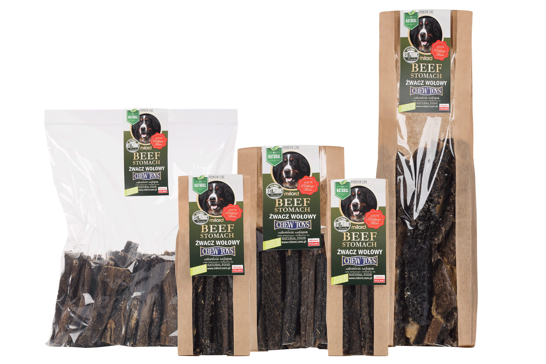 Żwacze wołowe Milord to naturalne gryzaki dla psa wykonane w 100% z nieczyszczonych żołądków wołowych. Dzięki temu zachowują swoje naturalne właściwości oraz intensywny aromat, który psy uwielbiają.
