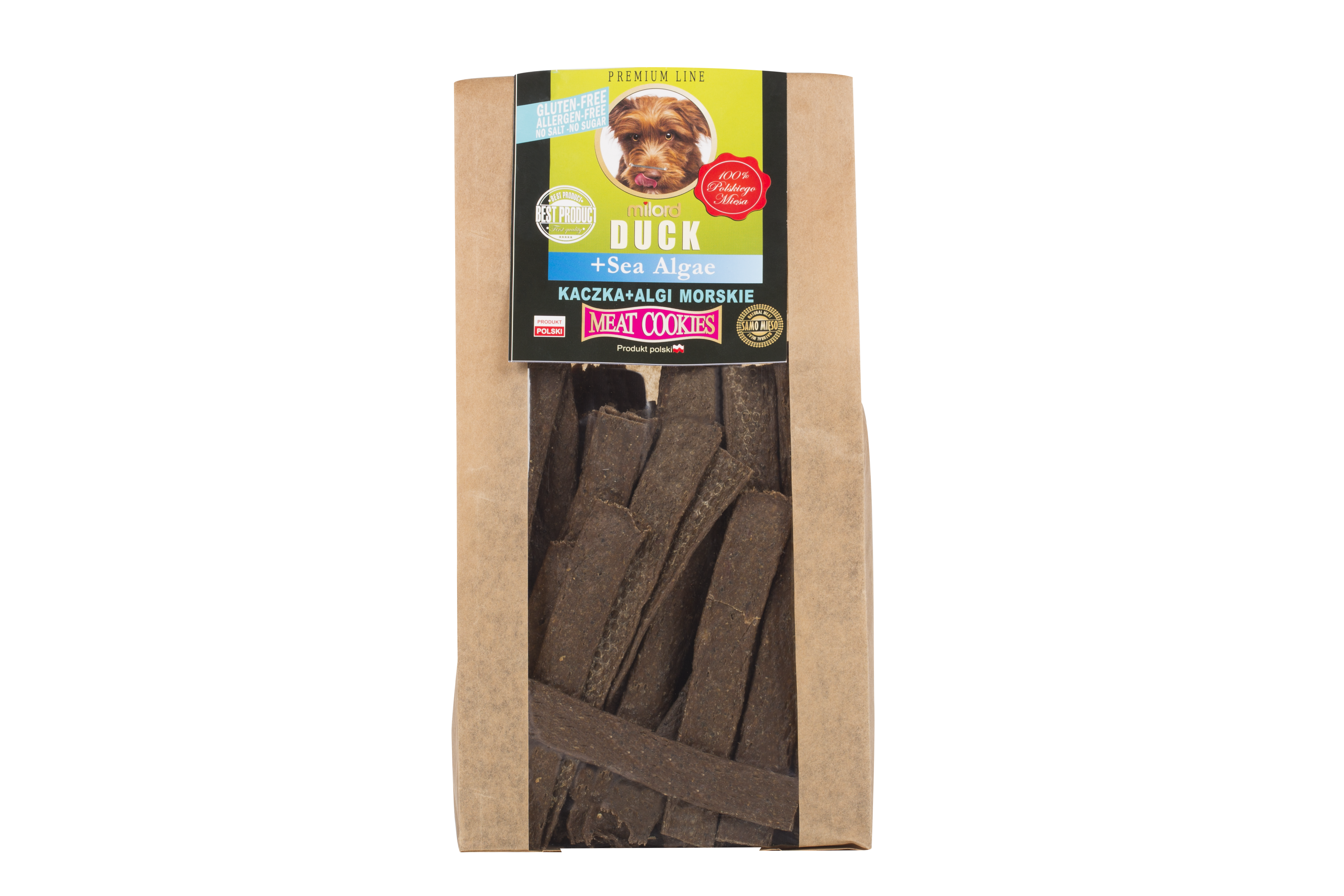 Kaczka z algami Milord to naturalny przysmak dla psa, który łączy wysokiej jakości mięso z kaczki z dodatkiem alg morskich. Dzięki prostemu składowi oraz delikatnemu procesowi suszenia przysmak zachowuje swoje naturalne wartości odżywcze i intensywny smak.