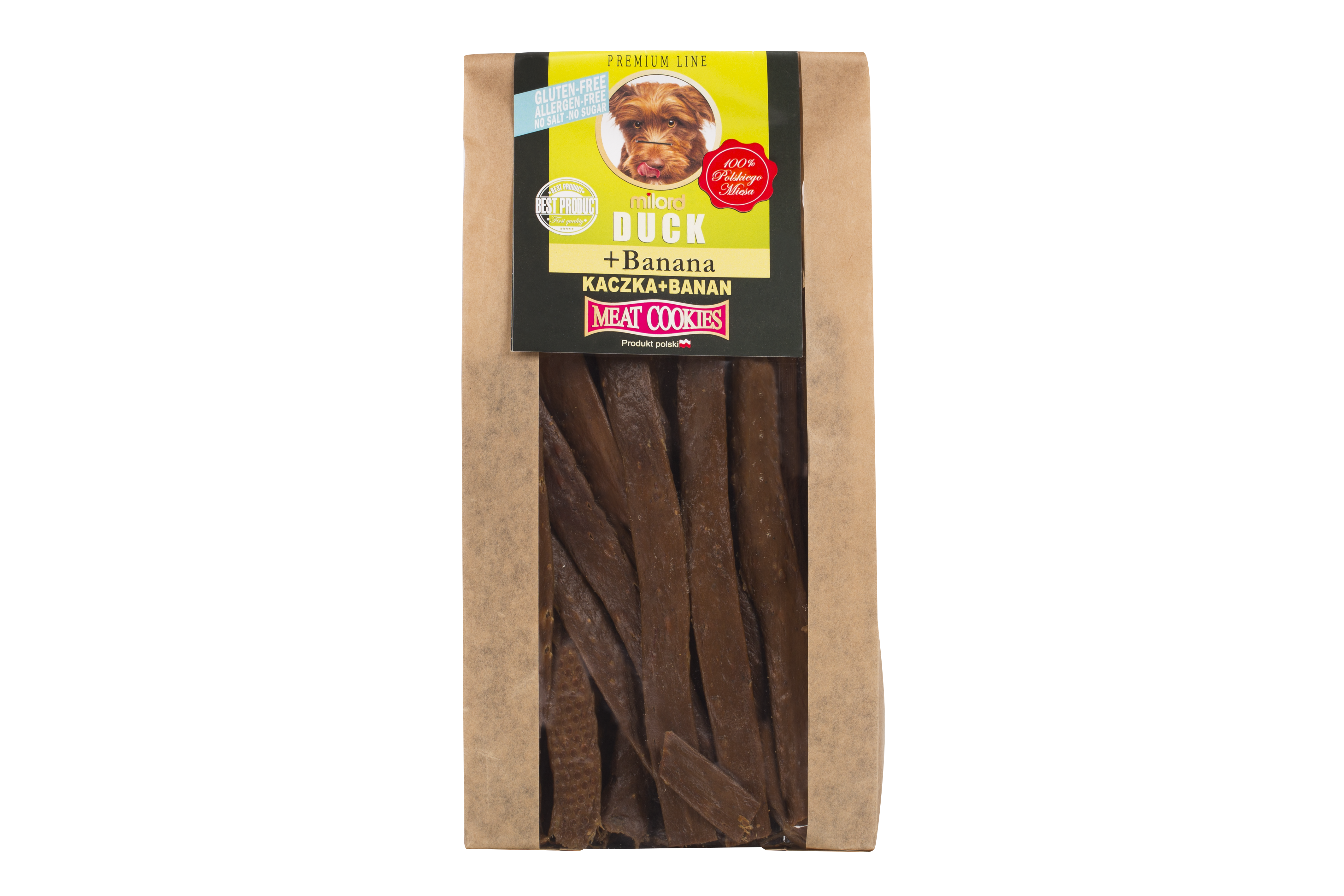 Kaczka z bananem Milord to naturalny przysmak dla psa, który łączy wysokiej jakości mięso z kaczki z dodatkiem banana. Dzięki prostemu składowi oraz delikatnemu procesowi suszenia przysmak zachowuje swoje naturalne wartości odżywcze i intensywny smak.