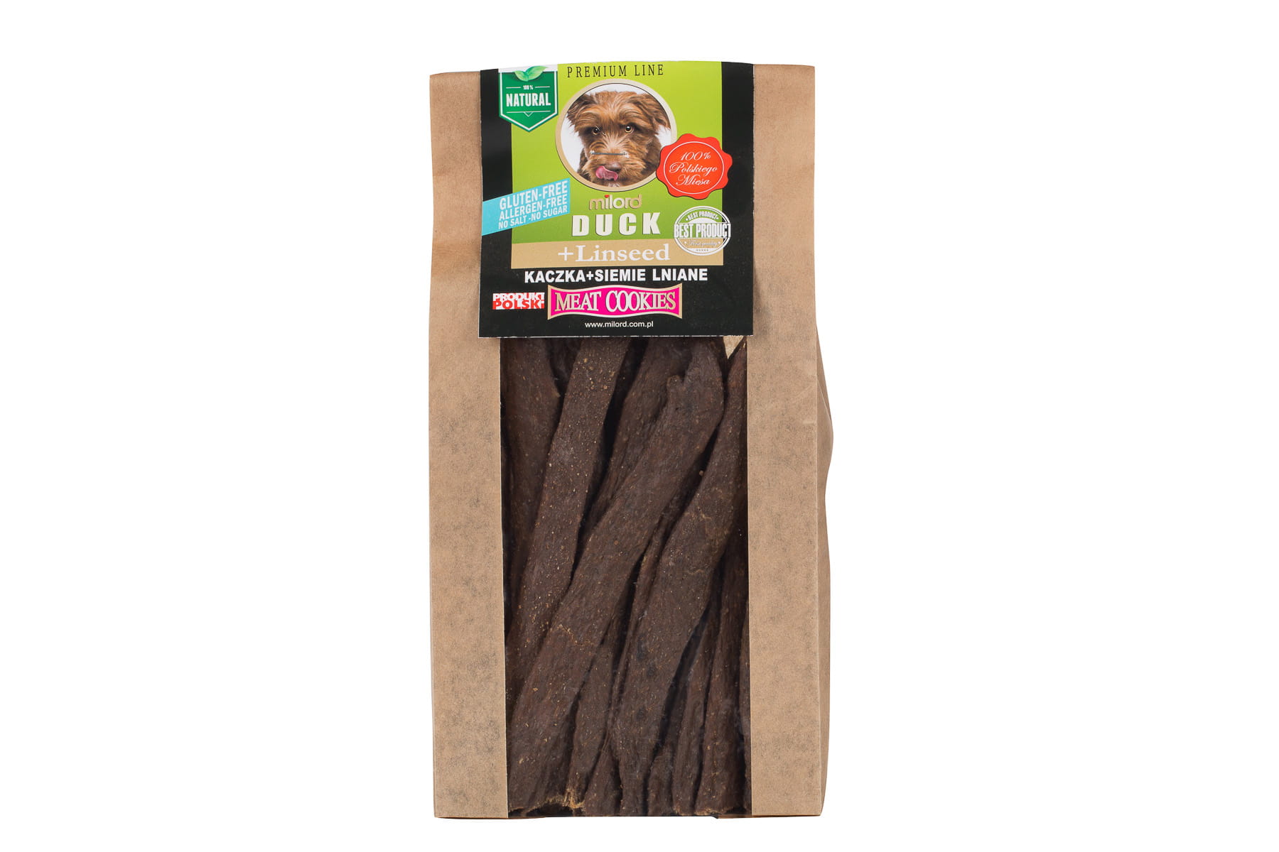 Kaczka z siemieniem lnianym Milord to naturalny przysmak dla psa, który łączy wysokiej jakości mięso z kaczki z dodatkiem siemienia lnianego. Dzięki prostemu składowi oraz delikatnemu procesowi suszenia przysmak zachowuje swoje naturalne wartości odżywcze i intensywny smak.