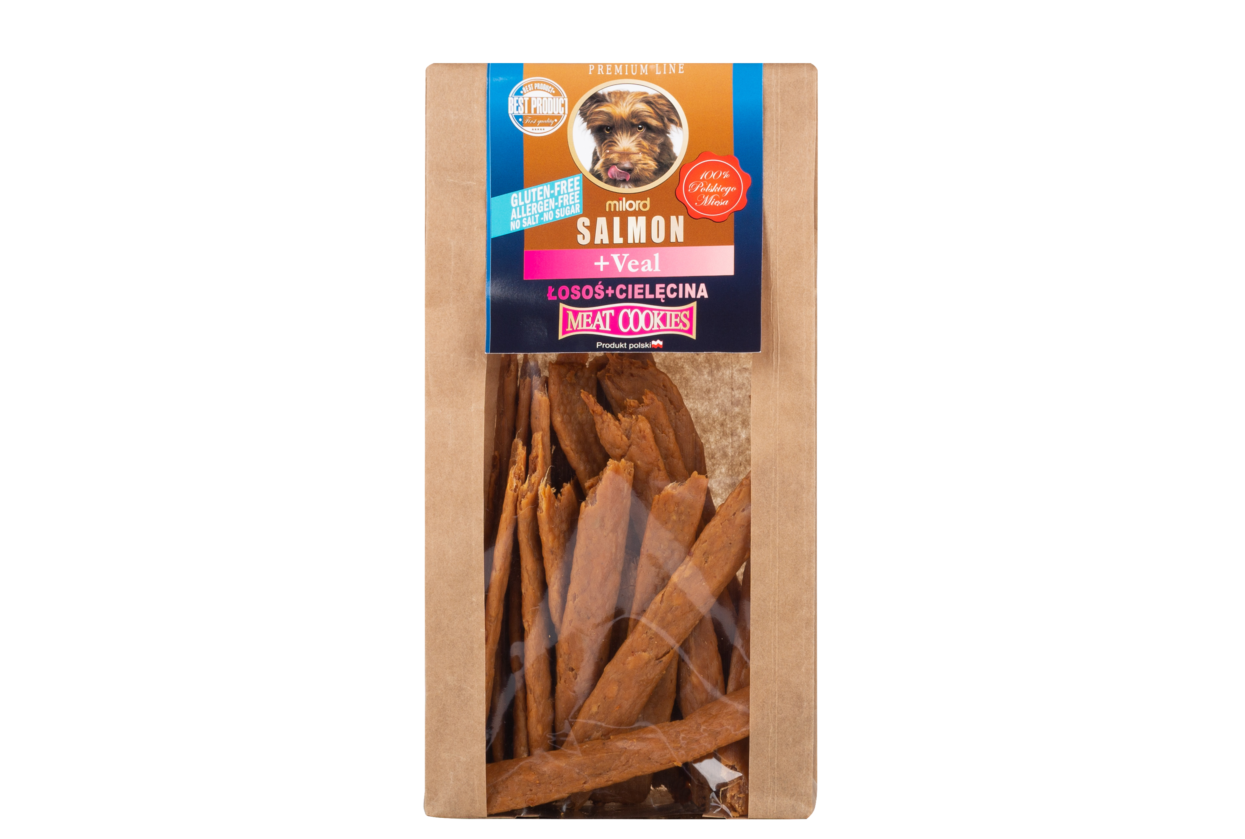 Łosoś z cielęciną Milord to naturalny przysmak dla psa przygotowany z wysokiej jakości filetu z łososia oraz mięsa cielęcego. Dzięki prostemu składowi oraz delikatnemu procesowi suszenia przysmak zachowuje swoje naturalne wartości odżywcze i intensywny smak.