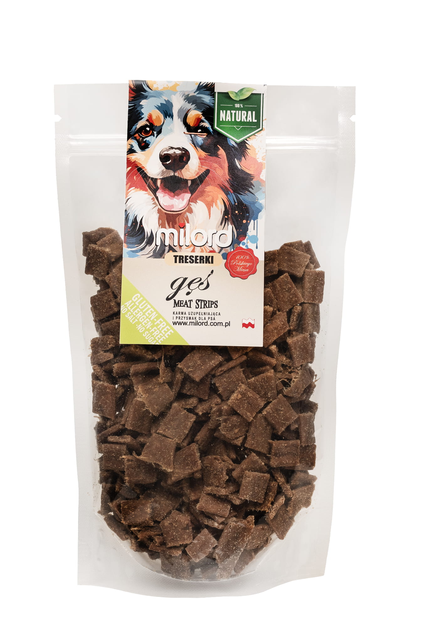Treserki z gęsi Milord to naturalne przysmaki treningowe dla psa w formie małych, wygodnych kawałków, które idealnie sprawdzają się podczas szkolenia, spacerów i codziennej pracy z pupilem. Powstają w 100% z mięsa mięśniowego z gęsi, dzięki czemu są wyjątkowo aromatyczne i bardzo smakowite.