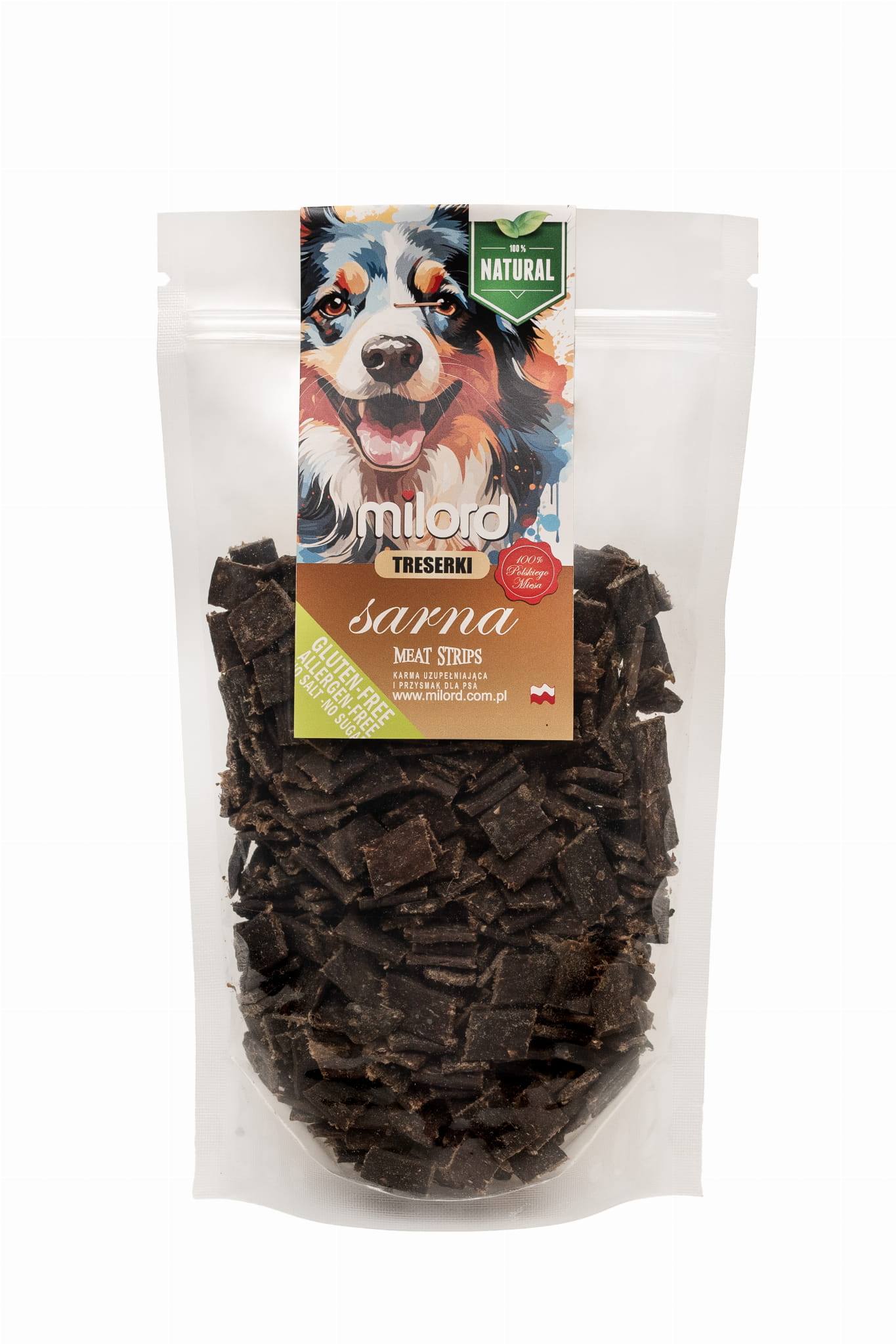 Treserki z sarny Milord to naturalne przysmaki treningowe dla psa w formie małych, wygodnych kawałków, które idealnie sprawdzają się podczas szkolenia, spacerów i codziennej pracy z pupilem. Powstają w 100% z mięsa mięśniowego z sarny, dzięki czemu są lekkostrawne i bardzo dobrze tolerowane nawet przez psy z wrażliwym układem pokarmowym.